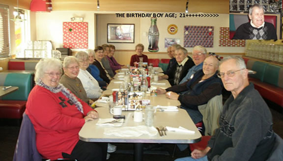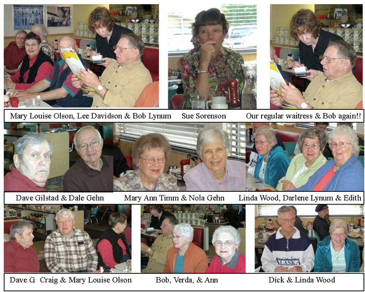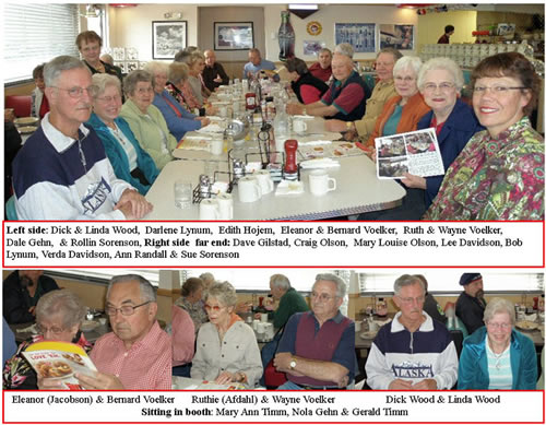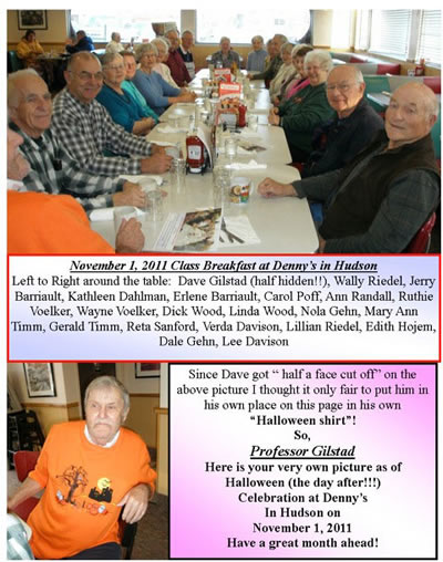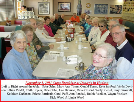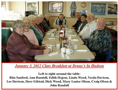 February 5, 2013 Class Breakfast at Denny's in Hudson Starting at the left, clockwise around the table: Ruthie Voelker, Mary Louise Olson, Edith Hojem, Rita Sanford, Verda Davison, Lee Davison,Dave Gilstad, Wally Reidel, Dick Wood, Linda Wood, Lillian Riedel, Craig Olson and Wayne Voelker, and Minnard Hojem who took the photo! |