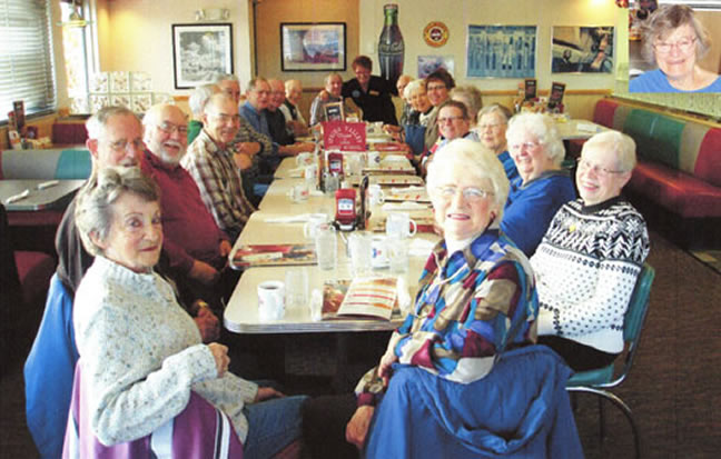 October 7, 2014 Class Breakfast at Denny's in Hudson Left to right around table: Lillian Riedel, Dick Wood, Minnard Hojem, Jerry Barriault, Gerald Timm, Wayne Voelker, Rollin Sorenson, Dale Gehn, Lee Davison, Dave Gilstad, (Waitress), Wally Riedel, Verda Davison, Nola Gehn, Sue Sorenson, Mary Ann Timm, Erlene Barriault, Kathleen Dahlman, Edith Hojem, Linda Wood & Ann Randall. (Anita Sundberg in upper right corner!! Late arrival!!!) |