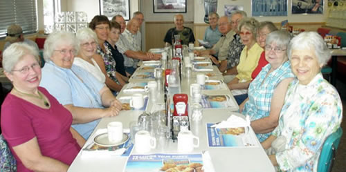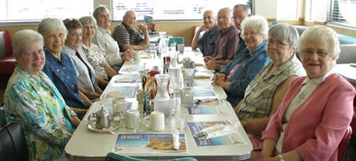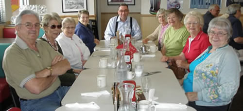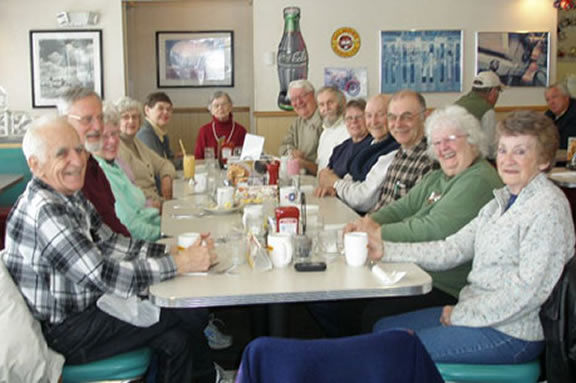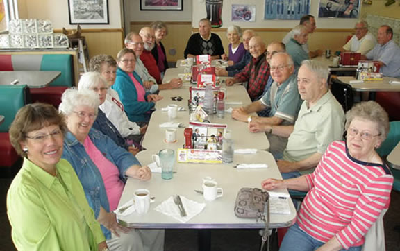 May 29, 2012 - Breakfast at Denny's in Hudson with John & Cheryl Barstad from Alaska! Left to Right: Wayne Volker, Ruthie Volker, Lorraine Punchard, Cheryl Barstad, John Barstad, Carol Poff, Anita Sundberg, Ann Randall, Reta Sanford. (Dale & Nola Gehn & Minnard Hojem were there but did not get in on the picture!!) |
