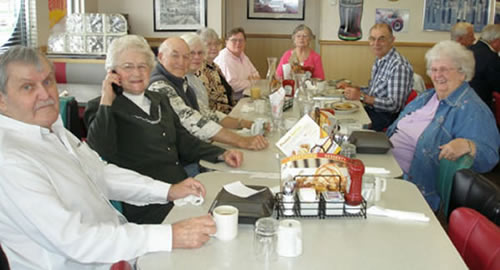 May 1, 2012 - Class Breakfast at Denny's in Hudson Left to right around the table: Edith Hojem, Lillian Riedel, Rita Sanford, Sue Sorenson, Carol Poff, Nola Gehn, Verda Davison, Ann Randall, Lee Davison, Craig Olson, Mary Louise Olson, David Gilstad, Dale Gehn, Wally Riedel, Mary Ann Timm & Gerald Timm. |