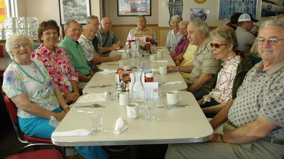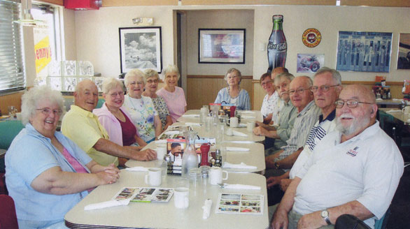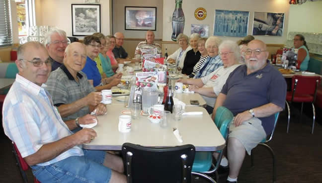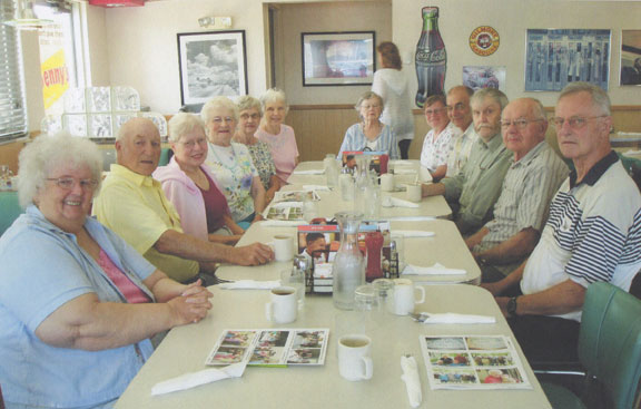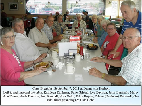 September 4, 2012 - Class Breakfast at Denny's in Hudson Left to Right: Ann Randall, Sue Sorenson, Rollin Sorenson, Lee Davison, Dick Wood, Dale Gehn, Dave Gilstad, Nola Gehn, Linda Wood, Mary Ann Timm, Gerald Timm, Ruthie Voelker & Wayne Voelker |