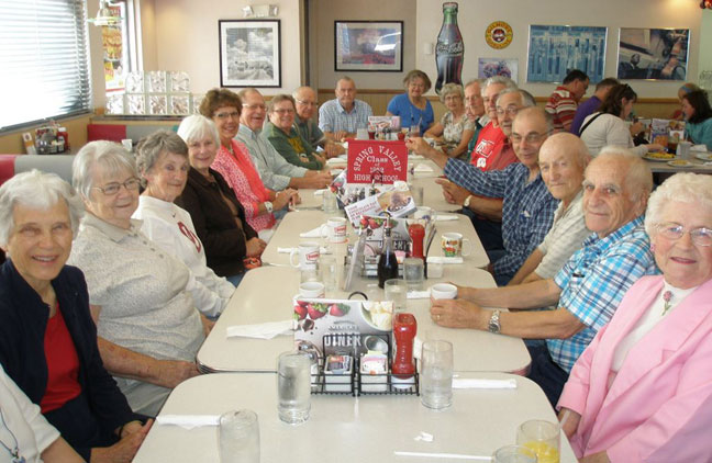 September 3, 2013 - Class Breakfast at Denny's in Hudson Left to Right around table: Dale Gehn, Wayne Voelker, Dick Wood, Linda Wood, Carol Poff, Ann Randall, Rita Sanford, Nola Gehn, Verda Davison, Lee Davison, Lillian Riedel, Wally Riedel & Dave Gilstad. Minnard & Edith Hojem were there but not on the picture! |