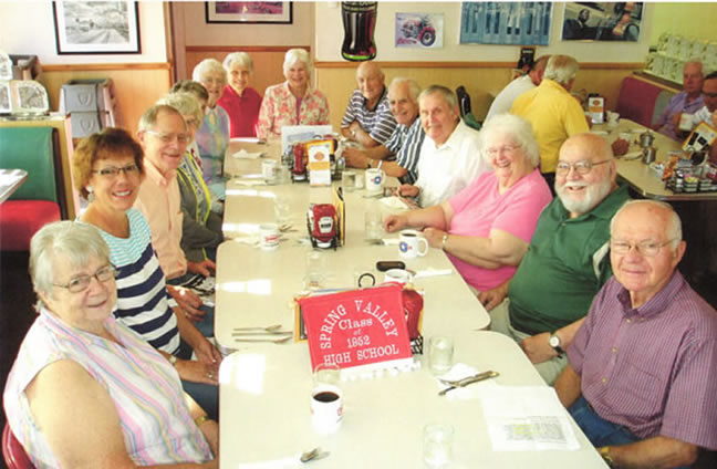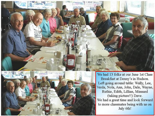 June 2, 2015 Class Breakfast at Denny's in Hudson Left to right: Ann Randall, Dick Wood, Wayne Voelker, Gerald Timm, Mary Ann Timm, Verda Davison, Lee Davison, Dale Gehn, Dave Gilstad, Caroll Poff, Edith Hojem, Mary Louise Olson, Craig Olson, Linda Wood, Nola Gehn, and Rita Sanford. Minnard Hojem took the picture! |