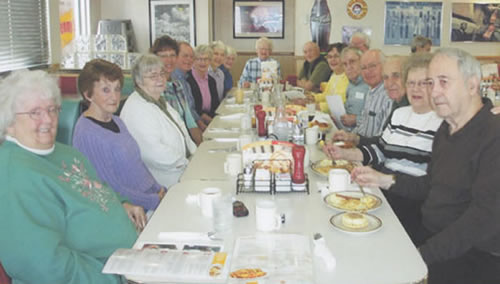 February 7, 2012 Class Breakfast at Denny's in Hudson Lillian Riedel, Linda Wood, Rita Sanford, Dave Gilstad, Verda Davison, Kathleen Dahlman, Erlene Barriault, Jerry Barriault, Lee Davison, Dick Wood & Wally Riedel. Photographer - Minnard Hojem |