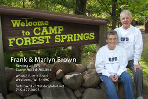 Frank and Marlyn Brown on their prayer card for their present full-time year-around volunteer work at a non-denominational Bible camp near Medford, WI. |