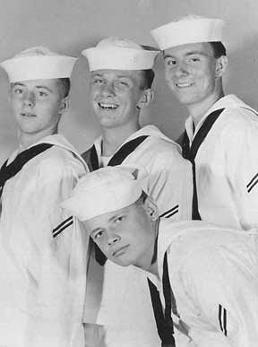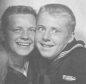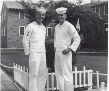 Yo-ho-ho and a bottle of "New Salts" Russ Pence and Tim Sandvig trade their graduattion gowns for swabby uniforms in August of their graduation year. |
