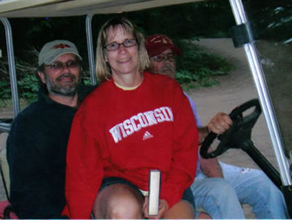 Daughter Kathy, her fiance Alan, and Jim on their golf cart at the lake. |