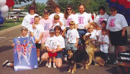 Note from daughter Lynn: Race For The Cure: From '98: Right after Mom went through chemo for breast cancer and weall did the Race For the Cure walk with Mom as a 'survivor' - so Mom's in the pink T-shirt. All five of Harold and Joan's kids and their eight grandkids, plus a daughter-in-law, another friend with her 2 kids, and Mary's 2 dogs. |