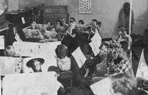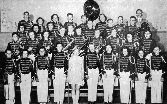 1951-52 Band Clarinets: Rosalie Holden, Shirley Olson, Rosemary Wolf, Barbara Brandt, Nancy Hanson, Karen Thompson, Colleen Ingli, Sue Ringrose, John Barstad, Mary Richardson. Cornets: John Kirk, Mary Christianson, Mary Rudesill, Kent Klanderman, Cherie Larson, Joan Traynor, Peggy Madson. Saxaphones: Mary Louise Olson, Lorraine Jacobson, John Miller, Marvel Klecker. Trombones: Tom Forthun, Nola Madson, Joseph Alms, Kevin Britton. Baritone: Troy Hanson, Gary VanDeList. French Horns: Ruth Thompson, Beverly Brandt, Betty Thompson, Mila McClellan, Ruth Hojem. Drums: Elizabeth Moser, Anita Larson, Robert Jacobson. Bass Horns: Oscar Barstad, James Sands. |