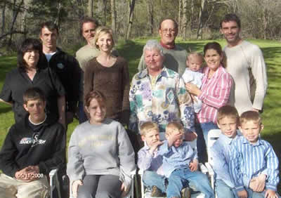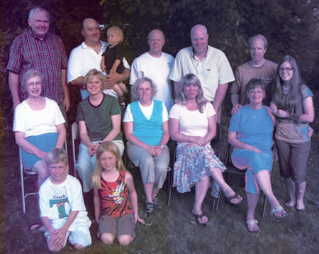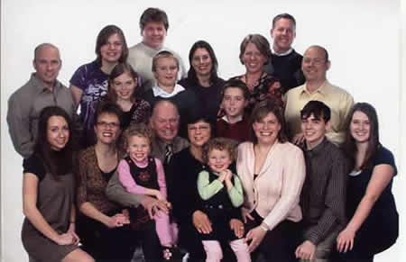 Ramona and Denny Sanders with their family Left to Right (Couples): Ramona and Denny, Jim, Kari & Erik Hallowell, Todd & Susan Sorenson, Scott & Bonny Sorenson, Tim, Julie & Celinda Sorenson Front: Tristan and Kyla Sorenson (Scott's children) |