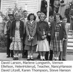 Highland Ridge, my little one room school house closed when I was going into the 8th grade.  I left a school that with all 8 grades didn't have near as many kids in it as my new 8th grade class did in Spring Valley.  I went from Mrs. Wallesverd, whom I had had for a teacher ever since the second grade; a Lady that treated me as much like a daughter as a pupil.   I remember loving it when she would French braid my hair, and when we had a snow storm so she couldn't get home she would stay over night at our house.  I went from this to MISS HELEN CROWELY in Spring Valley, a lady that I had never laid eyes on before!  Now to a timid, bashful country kid that I was, coming alone without any other classmates from my old school -- IT was very SCARY.   I soon learned that Miss Crowley was a very nice lady and I grew to really like her and respect her. It helped to know a few of the kids from Sunday school and I had the advantage of  knowing Bob Langer as my sister worked for his Mom keeping house.