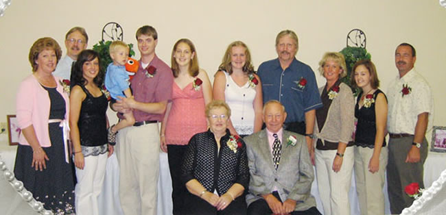 Esther and Dick with their family Bruce & Vicki (Daughter & Son-in-law), Dick & Esther, Daughter Carol (Husband Jeff not in picture), Daughter Penny with her Granddaughter Amelia (Dick & Esther's Great Granddaughter), Son Ken & Wife Tammy. Several - 13 Grandchildren & 15 of our 16 Greats missing). |