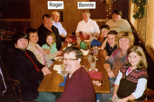 Starting with Roger and Bonnie at the top, going clockwise around: Tim & Kathy's son Justin; Teresa & Dan's sons Alex & Nick; our daughter Teresa; Teresa & Dan's daughter Sarah; our son-in-law Dan Webber; Tim & Kathy's son Jacob (in black); our daughter-in-law Kathy; Tim & Kathy's daughter Emalee; and our son Tim. |