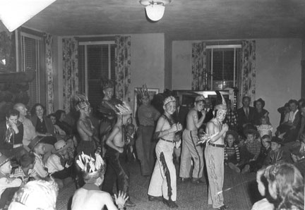 This picture was taken at the Congregational Church about 1950 during a Scout "Pioneer Days theme" performance. On the left is Sue Ringrose, Reverend Sterling and many dancers including Alois Ducklow, Billy Klanderman, Chuckie Ringrose and Lee Rutherford. On the drum, Bob Rutherford - in the background is Jim Rutherford. |