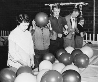 Junior Prom preparation Linda Timm, Balloon Heaad, Jim Rutherford, Gary VanDeList, Dorothy Timm |