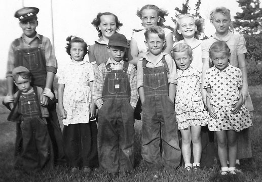 Gilman Mines Country School students Orlan says: I took this picture with a box camera in the late 1940's. It was a birthday party at our farm for my sister Mavis. All of these kids attended the Gilman Mines Country School and then later attended Spring Valley High School. Back row, left to right: Minnard Hojem ('53), Ruth Ellen Hojem ('55), Audrey Brorson ('53), JoAnn Brorson ('55), and Shirley Olson ('53). Front row, left to right: Wayne Hojem ('61), Doris Strom ('57), James Jorgenson ('58), Vernon Raehsler ('58), Ellen Raehsler ('60), and Mavis Youngren ('59). |