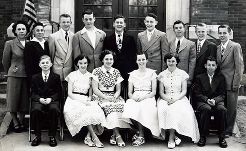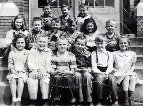 Class of 1955 as 3rd Graders First Row: Patty Wood, Dave Segerstrom, Gary VanDeList, Vic Langer, Dan Quilling, Rosemary Strehlow. Second Row: Jurnell Timm, Wayne Harshman, Dick Wilhelm, Ralph Ducklow, Gertrude Habig, Don Bemis. Third Row: Don Adank, Floyd White, Dave Madson. A couple of people think Gertrude Habig might be Romona Hebink - ?? |