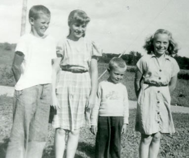 Wildwood Country School First Day of School for the Lynums - 1948 or 1949 Left to Right: Wayne ('55), Loretta ('53), Gail ('60), and Wanda ('55) |