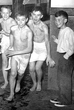 1949 or 1950 Jim Rutherford, Ralph Ducklow and Darrell Krenn running from the boys' shower room to the locker room (which was across the hallway). Don Blegen is directing traffic. That hallway was used by all students on their way to the hot lunch room. |