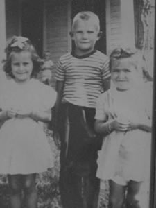 Karen Thompson ('56), (now Mrs. Gary VanDeList), girl on right is Mary Jo Richardson ('56), deceased wife of Russell Spence, boy in the center is Gary VanDeList. Picture taken on the girls first day of kindergarten. Gary escorted the girls to school and get them to the right school room. (Gary was the big first grader who is now married to Karen). |