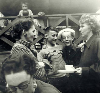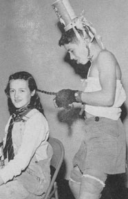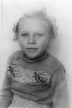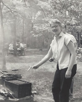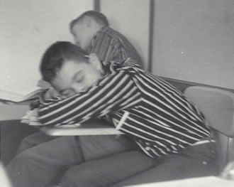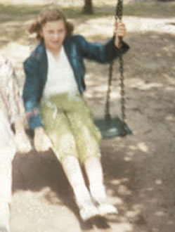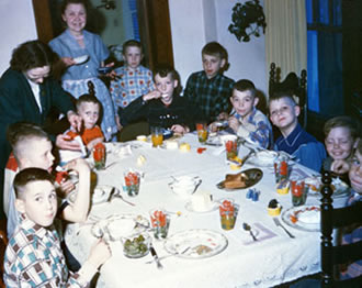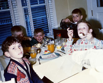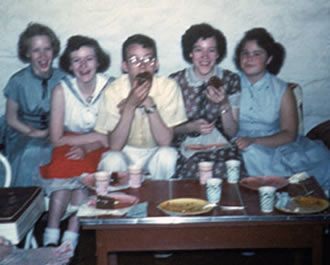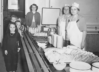 Judy Zimmer in elementary School, in the school cafeteria. Judy's grandma,Emma Zimmer, is the cook on the left. |