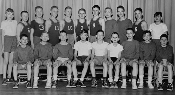 Basketball Team - 1955 Front row - Jimmy Anderson, Terry Wulf, Ross Taplin, Roger Wolski, Tommy Lamb, Win Hansen, Carl Safe, Wesley Wentlandt, Reese Ofstie |