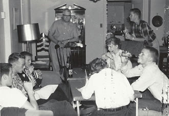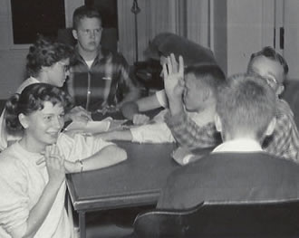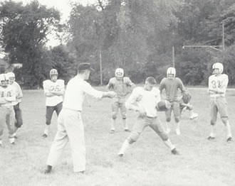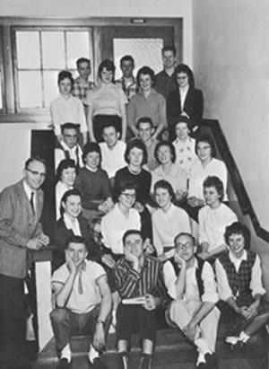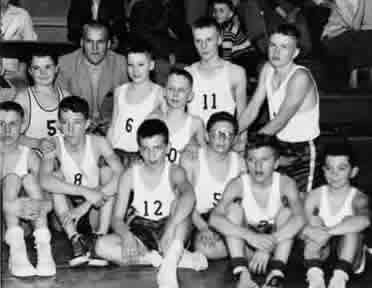 1956 Front: Dave Wood, Larry Olstad-#8?, Carl Safe-#12, Steve Carpenter, Roger Wolske, Ross Taplin. Back: Don Richardson-#5, Coach Loren Kamish, Dick Rudesill(#6), Win Hanson, Lyle Christopherson-#11, Mike Reid |