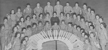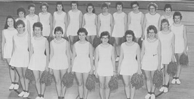 Drill Team This year's Vallettes consisted of twenty-two members. They performed at many football and basketball games, at a P.T.A. meeting, and a pep meeting. New outfits, consisting of black derbies, black canes, and black trim on their original outfits, brought a welcomed change. Many favorable comments were heard about the group. |