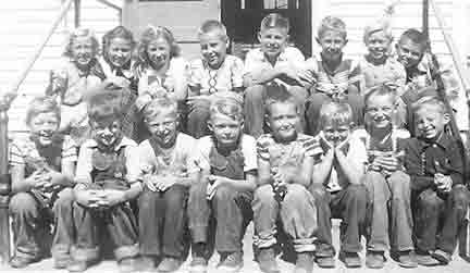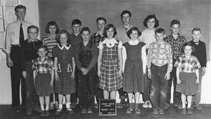 Locust Grove School - 1953 Teacher: Kenneth Roen. Back: Frank Niedermeyer, Helen Gjovig, David Wettleson, Roger Halvorson, Charles Gjovig, Judy Truesdale, Larry White, Dean (Eugene) Sebion. Front: Linda Halvorson, Paricia Neidermeyer, Louie White, LaVonne Anderson, Judy |