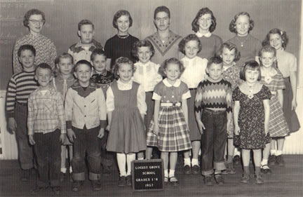 Locust Grove School - 1957 Teacher: Cherie Larson. Front Row: Eddie Hanson, Kurt Munson, Nancy Bee, LeAnn Jahr, Ricky Vanasse, Patsy Mattison. 2nd Row: Brian Munson, Julie Sebion, Micky Mattison, Linda Halverson, Luella Halverson, Jeanne White, Lorna Hanson, 3rd Row: Miss Larson, Dean Sebion, LaVonne Anderson, Louie White, Judy Rudesill, Patricia Neidermyer, Norman Chilson. |