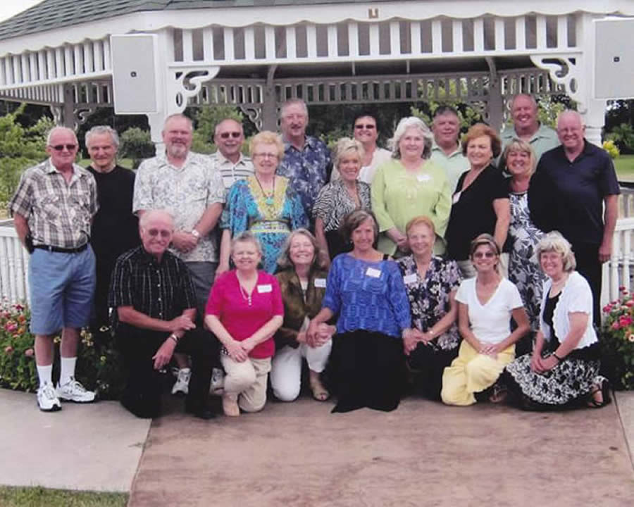 Front Row Left to Right: Ted Bergum, Mary Hendrickson Thompson, Judi Hillstead Ernst, Joy Stefon Spindler, Lana Bjornson Johnson, Cheri Helgeson Timm, Judy Klecker Steiner,Barb Jones Staupe, Harriet Lansing, Russell Grape, Gary Peterson Back Row Left to Right: Dale Wells, Susan Davis Hanson, Dawn Brooke Hunter, Charles Madson, Jeanne Werner Niccum, Ken Schuch, Gary Dodge, David Olson, Ron Wolske, Bill Odalen, Lavern Hauschildt. Jane Helgeson Whirry and Ron Cain came later but were not there for the picture. |