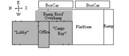 Illustration 1 pictures the depot from the Northwest corner. Our tour will start by walking through the door on that corner. There was another just like it directly across the ÒlobbyÓ (the ticketing and waiting room), so one could enter from the Northeast corner also. WeÕll walk our way south from the ÒlobbyÓ, through the depot agentÕs office, the cargo bay, out onto the platform and down the ramps.