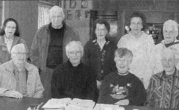 | Eight members of Sacred Heart Catholic Church along with Brother Michael, share the ministry and history of their church. First row: Tom Ryan, Brother Michael, LaMoine Hanson, Lorne Hanson. Second row: Gloria Ryan, Mickey Traynor, Rose Hovde, Genevieve Miller, and Genevieve Ducklow. Photo by Kaye Bird |