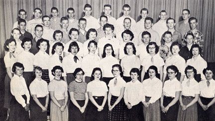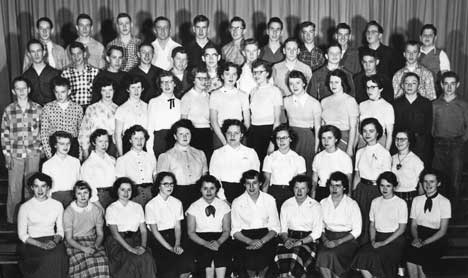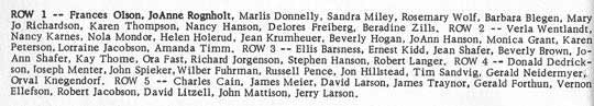 Row 1: Bev Hogen, JoAnne Rognholt, Rosemary Wolf, Barb Blegen, Beradene Zills, Kay Thome, Helen Holerud, Jean Krumheur, Mary Jo Richardson, Verla Wentlandt. Row 2: Frances Olson, Amanda Timm, Lorraine Jacobson, Ora Fast, Bev Brown, Karen Peterson, Franny Strom, Nancy Karnes, JoAnn Hanson. Row 3: Robert Langer, Arlen Doyle, Patsy Grant, Marlis Donnelly, Delores Freiberg, Jean Shafer, Nola Mondor, Joanne Shafer, Karen Hopwood, Karen Thompson, Sandra Miley, Stephen Hanson, Charles Cain. Row 4: Gerald Neidermyer, David Larson, Ellis Barsness, Wilbur Fuhrman, Richard Jorgenson, James Meier, John Spieker, Jon Hillstead, John Mattison, Donald Dedrickson, David Litzell. Row 5: Russell Pence, Gerald Forthun, Vern Ellefson, Donald Koehler, Robert Jacobson, Joe Menter, Ernest Kidd, Orval Knegendorf, James Traynor, Jerry Larson, Tim Sandvig. ABSENT: Nancy Hanson |